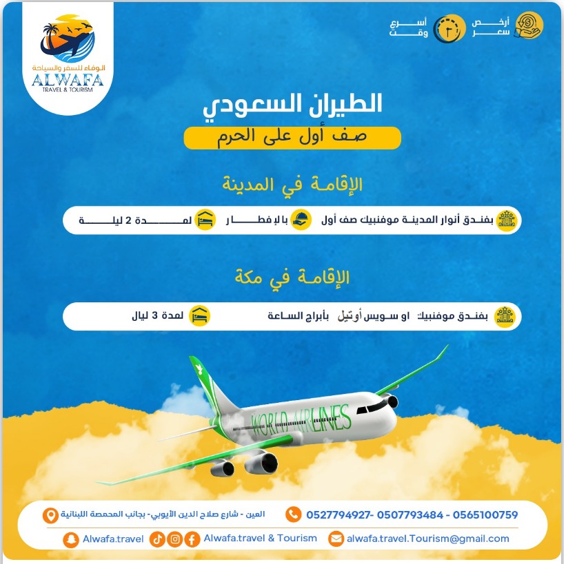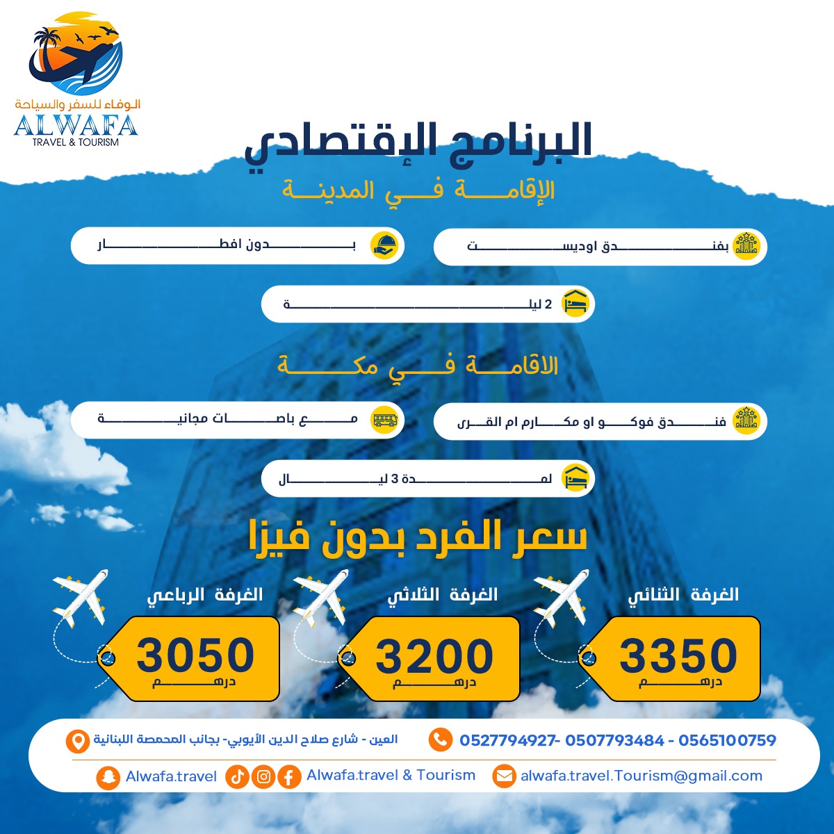 تفخر شركة الوفاء للسياحة والسفر بكونها شريكك الموثوق به في تسهيل الرحلات الروحية إلى المدن المقدسة في مكة المكرمة والمدينة المنورة. نحن متخصصون في تقديم حزم العمرة الشاملة وخدمات التأشيرات السعودية ، ومساعدة الأفراد على الوفاء بالتزاماتهم الدينية بكل سهولة وراحة وراحة البال.