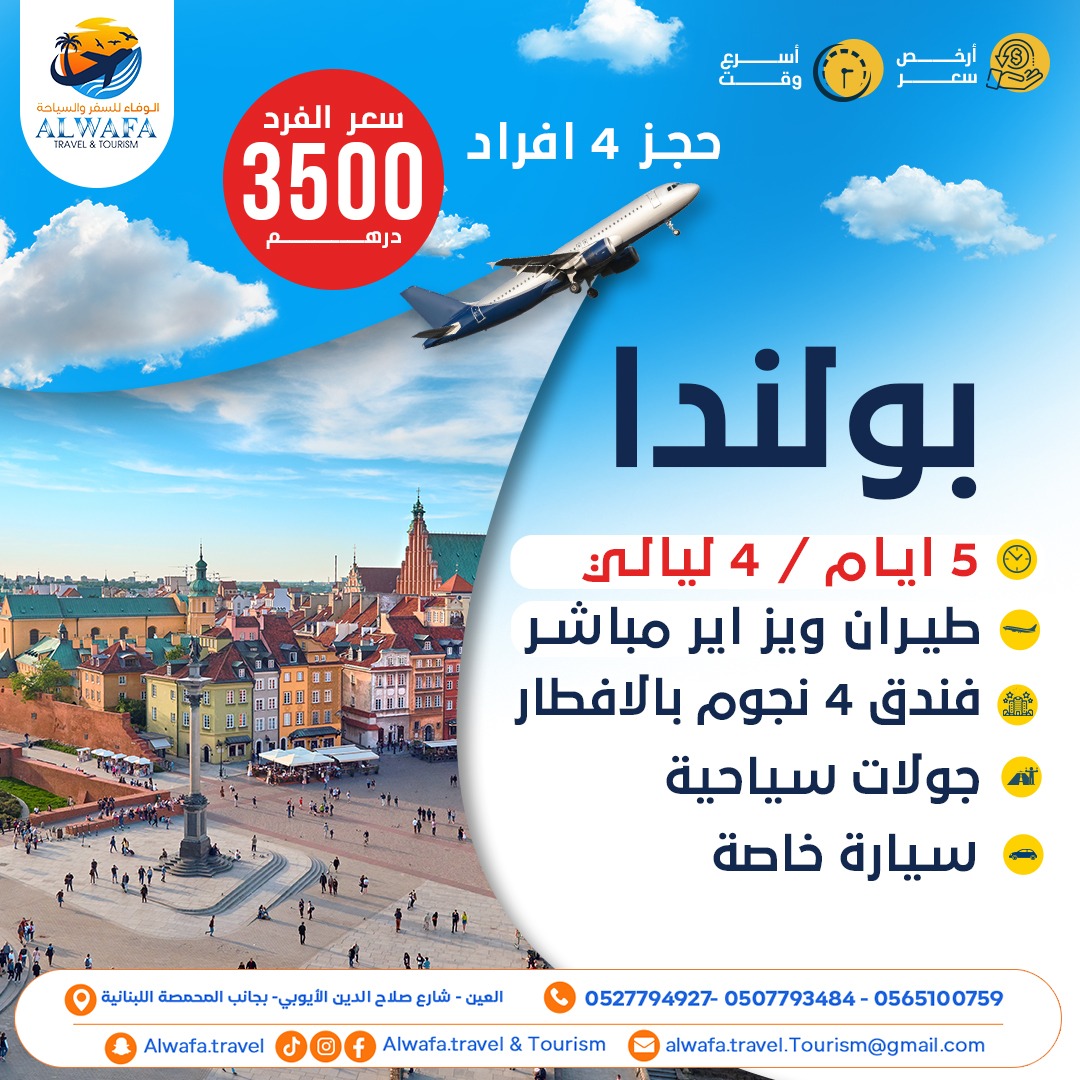 باكدج بولندا تفقد عروض الوفاء الدورية بولندا 5 ايام / 4 ليالي من ابوظبي - كراكوف والعودة مباشر علي ويز اير يشمل الاستقبال والتوديع فندق 4 نجوم بالافطار سيارة خاصة مع السائق في الجولات السياحية شامل الضريبة سعر الفرد 3500 درهم ( في حالة حجز 4 افراد ) احجز الأن دعنا نحجز رحلتك القادمة معا. الاسم *البريد الالكترونيالهاتف *الرسالة0 / 180إرسال الرسالة اتصل بنا الأن 0097137333545 00971527794927 alwafa.travel.tourism@gmail.com